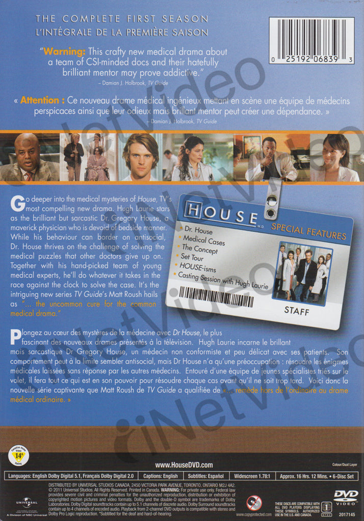 {"year":{"key":"year","description":"Year","value":"2009","value_type":"string","namespace":"year"},"country":{"key":"country","description":"Country","value":"CAN","value_type":"string","namespace":"country"},"actors":{"key":"actors","description":"Actors","value":"Hugh Laurie, Jennifer Morrison, Lisa Edelstein, Omar Epps, Robert Sean Leonard, Hugh Laurie, Jennifer Morrison, Lisa Edelstein, Omar Epps, Robert Sean Leonard","value_type":"string","namespace":"actors"},"region":{"key":"region","description":"Region","value":"NTSC-U/S (United States/U.S. territories, Canada or Bermuda systems)","value_type":"string","namespace":"region"},"publisher":{"key":"publisher","description":"Publisher","value":"UniversalBoxset131109","value_type":"string","namespace":"publisher"},"discs":{"key":"discs","description":"Discs","value":"6","value_type":"string","namespace":"discs"},"runtime":{"key":"runtime","description":"Runtime","value":"965","value_type":"string","namespace":"runtime"},"format_size":{"key":"format_size","description":"Format size","value":"Widescreen","value_type":"string","namespace":"format_size"},"subtitles":{"key":"subtitles","description":"Subtitles","value":"Spanish","value_type":"string","namespace":"subtitles"}}