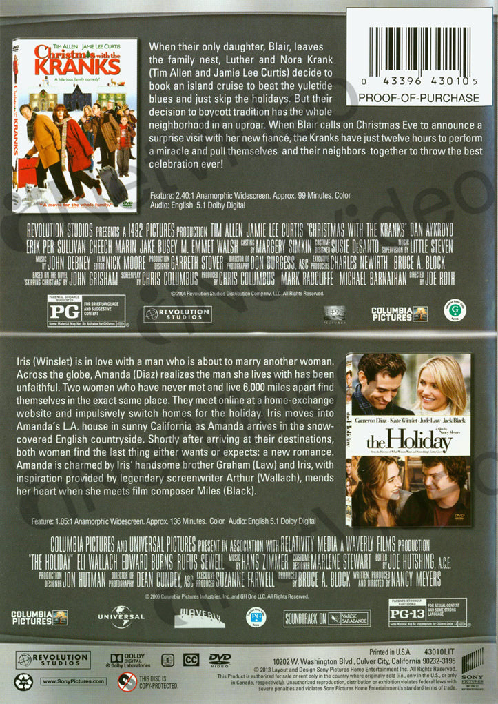 {"year":{"key":"year","description":"Year","value":"2006","value_type":"string","namespace":"year"},"country":{"key":"country","description":"Country","value":"US","value_type":"string","namespace":"country"},"actors":{"key":"actors","description":"Actors","value":"Cameron Diaz, Jamie Lee Curtis, Kate Winslet, Tim Allen, Cameron Diaz, Jamie Lee Curtis, Kate Winslet, Tim Allen","value_type":"string","namespace":"actors"},"region":{"key":"region","description":"Region","value":"NTSC-U/S (United States/U.S. territories, Canada or Bermuda systems)","value_type":"string","namespace":"region"},"rating":{"key":"rating","description":"Rating","value":"PG-13","value_type":"string","namespace":"rating"},"publisher":{"key":"publisher","description":"Publisher","value":"warehouse","value_type":"string","namespace":"publisher"},"discs":{"key":"discs","description":"Discs","value":"1","value_type":"string","namespace":"discs"},"runtime":{"key":"runtime","description":"Runtime","value":"235","value_type":"string","namespace":"runtime"},"director":{"key":"director","description":"Director","value":"Joe Roth","value_type":"string","namespace":"director"},"format_size":{"key":"format_size","description":"Format size","value":"Widescreen","value_type":"string","namespace":"format_size"}}